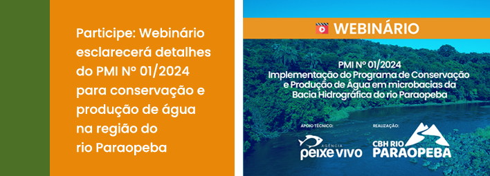 O Comitê da Bacia Hidrográfica do Rio Paraopeba (CBH Paraopeba) convida para um Webinário informativo sobre o Procedimento de Manifestação de Interesse. O objetivo é detalhar as orientações sobre o PMI Nº 01/2024. O Webinário aconterá por meio da Plataforma Microsoft Teams...